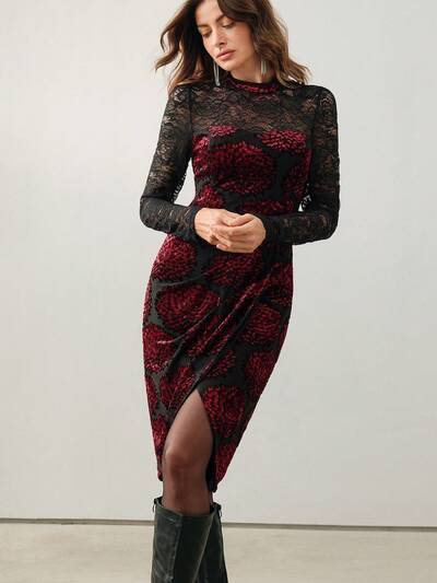 Vintage Floral Velvet Patchwork Lace Trim Dress Burgundy Maxi Women Outfit-23%