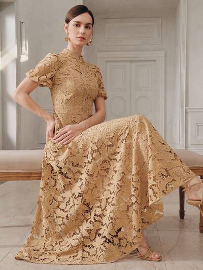Anewsta Plus Size Women's Blue Romantic Elegant Mandarin Collar Flare Sleeve Floral Embroidered Mesh Slim Fit Maxi Dress, Patchwork Lace Ribbon Decor, Suitable For Daily, Vacation, Party, Valentine's Day, Wedding And Other Occasions-25%