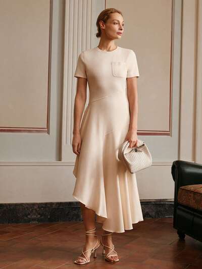 Anewsta Elaire Anewsta Women's Knitted High-End Air Layer Waist Slimming Fashion Fish Tail Short Sleeved Round Neck Beige Dress Old Money-60%