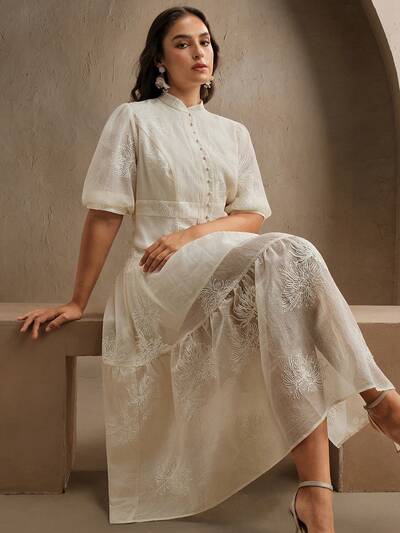 Vestido de verano de cuello alto de encaje con textura y cintura acampanada, talla grande, nueva colección