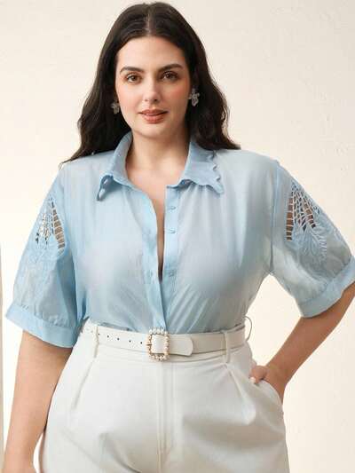 Blusa elegante de verano con hombros cortados, bordado y mangas cortas