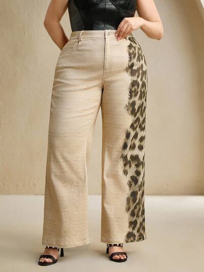 Pantalones rectos de estilo casual con estampado de leopardo asimétrico, diseño único de pantalones largos para mujer, adecuados para el festival Old Money, vacaciones, días festivos, elegante