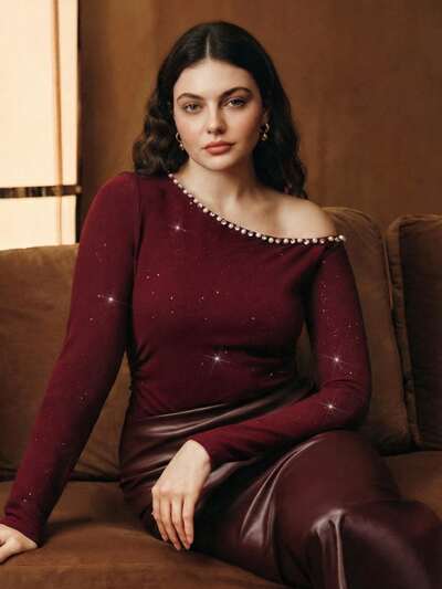 Nueva blusa de manga larga con hombros oblicuos, con aplicaciones de strass rojos, adecuada para primavera y fiestas de San Valentín, talla grande para mujeres