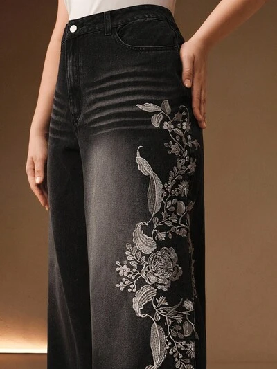 Jeans rectos de pierna negros con bordado estilo vintage para mujer