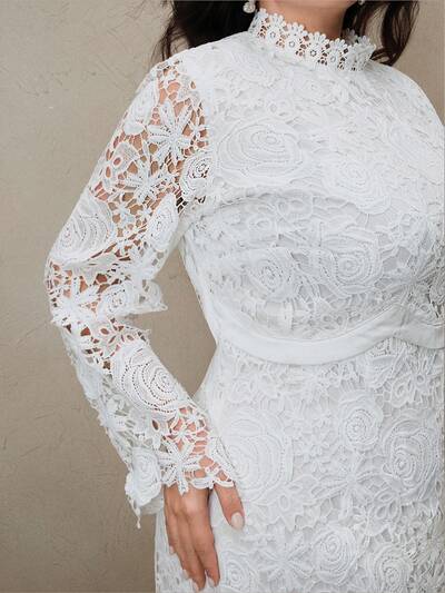 Vestido de encaje de manga larga con cuello alto en unicolor elegante para tallas grandes-32%
