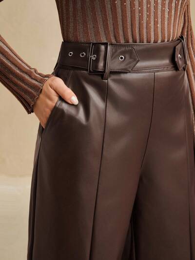 Pantalones rectos de piel sintética ajustados con cinturón para mujer en color marrón, adecuados para primavera a verano
