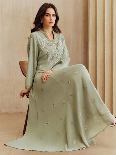 Bata elegante de mujer con cuello alto, bordada a mano con cuentas, corte evasé y longitud hasta el suelo