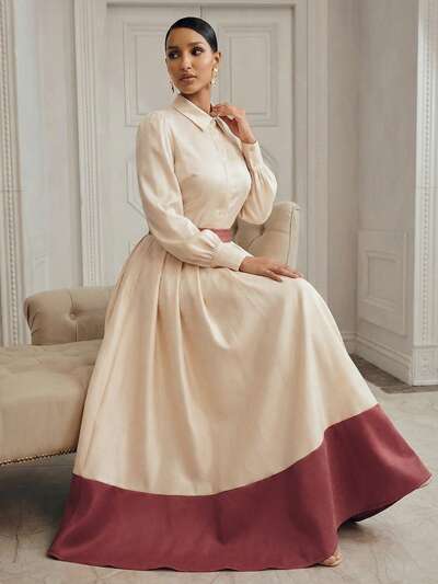 Conjunto de 2 piezas de blusa de manga abullonada elegante y falda acampanada con bloques de color, color albaricoque
