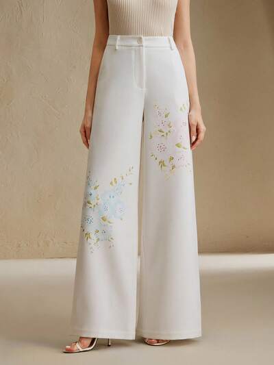 Pantalón holgado de pierna recta de cintura alta con estampado floral elegante para dama de oficina