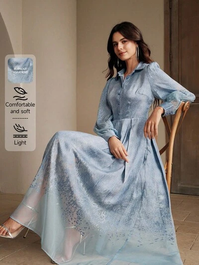 Vestido de manga larga con estampado degradado azul elegante y acampanado para mujer