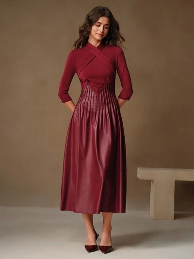 Vestido elegante de largo medio unicolor, con plisado cruzado en diseño línea A, color burdeos para mujer-33%