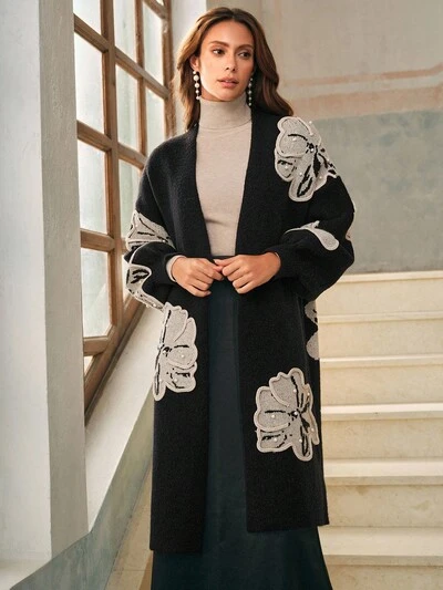 Cárdigan holgado de punto para mujer, chaqueta de invierno de alta gama con textura jacquard negra