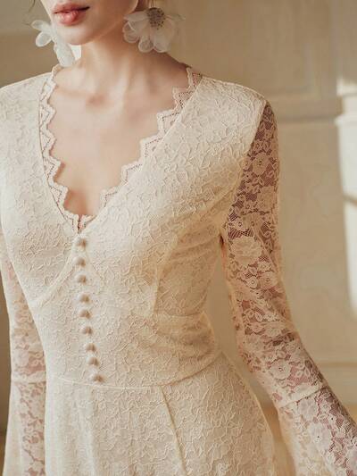 Vestido largo de mujer de manga larga con encaje, elegante, delicado y lujoso con silueta evasé en color beige, adecuado para el Día de San Valentín, con mangas acampanadas