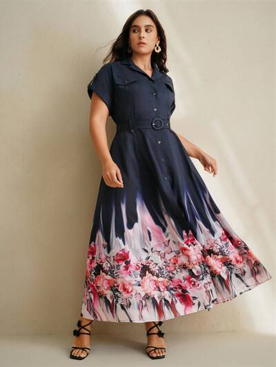 Nuevo vestido de manga corta con estampado floral, de corte retro y elegante, de talla grande y abotonadura sencilla