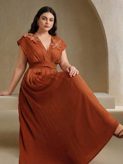 Vestido elegante con cuello en V, cintura ceñida y decoración floral, talla grande, adecuado para graduación, festival, vacaciones, ocasiones elegantes, vacaciones, estilo de dinero antiguo, cita
