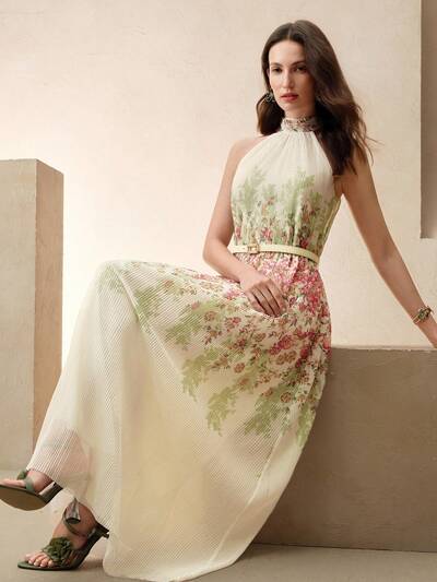Vestido largo con estampado floral, cintura fruncida, elegante y romántico para mujeres en la primavera/verano, ideal para vacaciones. Vestido de gala formal con cuello halter y flores de melocotón