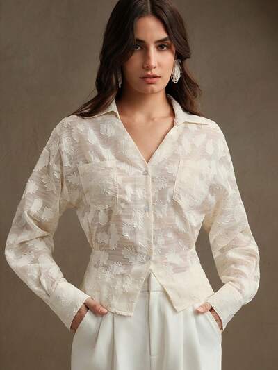 Conjunto de 2 piezas de camisa de manga larga con botones y pantalones bordados para mujer, vestimenta vacacional, primaveral, casual, moderna, elegante, floral, de festival