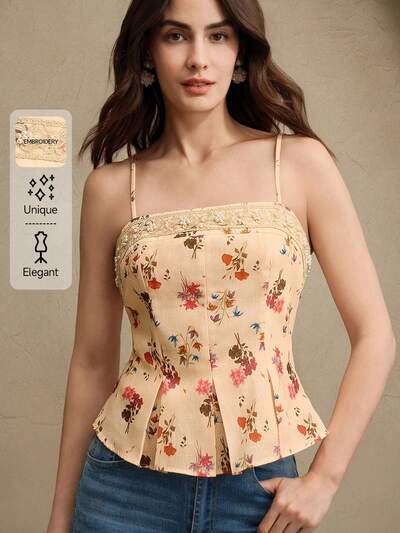 Camiseta de tirantes con estampado floral, escote trasero, elegante y romántica para fiesta o cita, con decoración de cinta y perlas falsas, para primavera/verano