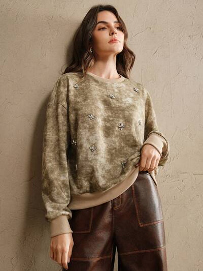 Sudadera con cuello redondo y pedrería para mujer, sudadera informal lavada con prenda de otoño