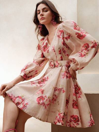 Nuevo vestido mini con estampado floral, cuello en V, manga farol y cinturón, con estilo francés de primavera/verano