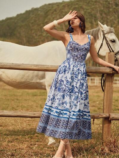 Vestido largo elegante de mujer de línea A con estampado de porcelana azul y blanco, escote en V, sin espalda, cintura ceñida, para verano, estilo bohemio, playa, vacaciones y festivales