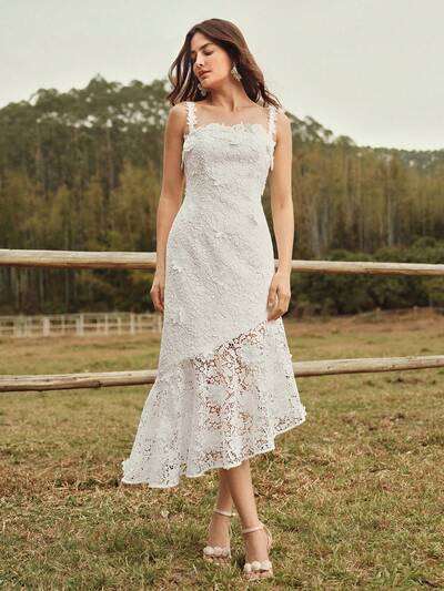 Vestido de sirena de noche elegante y romántico para mujer con tirantes de espagueti, aplicaciones de encaje 3D solubles en agua y largo a mediados de la pantorrilla, para uso en verano, playa y vacaciones casuales