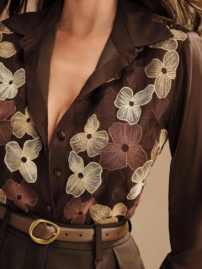 Camisa de satén con flor 3D hueca y elegante de color Marla para mujer, casual, para salir, vacaciones y festivales-60%