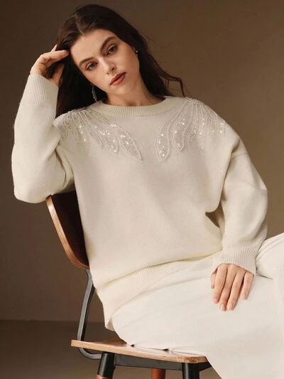 レディース カジュアル ハンドメイド 刺繍 ニット ブラック 長袖 プラスサイズ スウェットシャツ、秋冬 マルーンレッド カジュアル スパンコール スウェットシャツ-60%