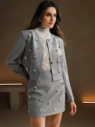 2ピースセット レディース フレンチスタイル 3Dメタルスパンコール付きクロップド丸首グレージャケットとスカート-60%