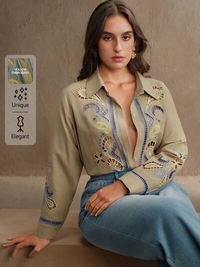 プラスサイズの女性 中空刺繍 長袖 襟付きブラウス-30%