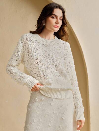 女性用 テクスチャード パール ホワイト ヘビーウェイト セーター、ファッショナブルなクルーネック ニットトップ 冬用-61%