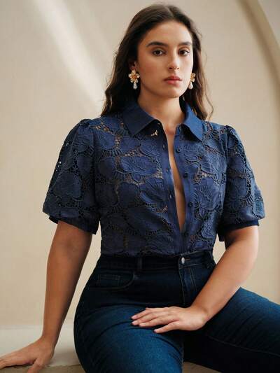 レーストップ プラスサイズ レディース、フィット感、エレガント、多用途、セミシアー プルオーバートップ-35%