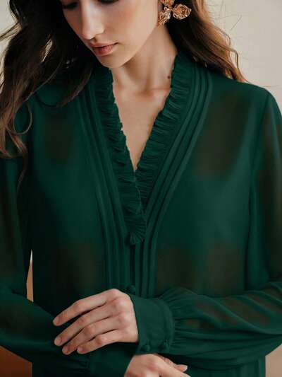 Anewsta Essential エレガントなフレンチスタイル Vネック フリルトリム ブラウス、ファッショナブルで優雅、新年、春、夏、ホワイト、バレンタインデーに適しています-23%