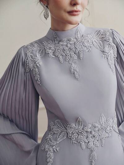 優雅な軽量グレースタンドカラー アップリケスリーブ プリーツウエスト フローイング ロングスリーブドレス レディース、春夏-32%