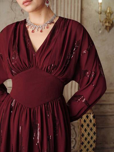 エレガントなシーケンスシフォンロングスリーブドレス、ワインレッド、ハイエンド、パーティー、バンケット、デートに適しています。ウエストラインがきれいに見え、ロング丈、レディース用-28%