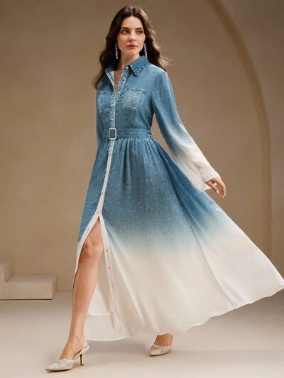 女性用エレガントなオンブレ長袖ドレス、高級グラデーションブルー、秋冬-21%