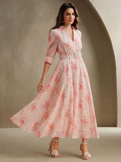 ロマンチックなジャカード柄、7分袖Vネックミディドレス、ベルト付き、バケーションスタイル、バレンタインデーに最適-23%