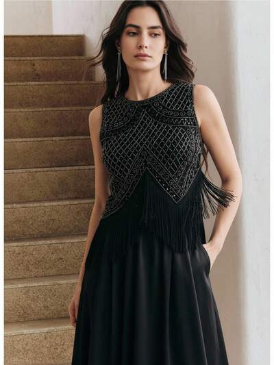 女性用 新作ファッションストリートスタイル ビーズ付きタッセルノースリーブトップ、フォーマルな場面に適しています-23%