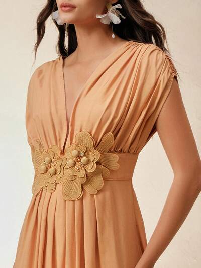 エレガントなウエスト フローラルデコレーション フィット アンド フレア シャーリング バケーションビーチドレス、フェスティバル ボヘミアン アウトドア バケーションアウトフィット、春夏-23%