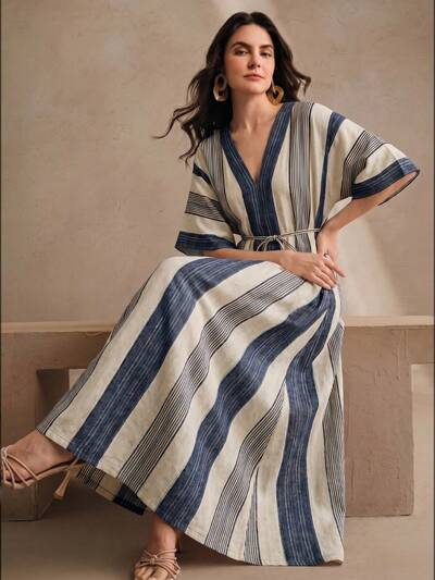 ルーズVネック プリントビーチドレス、ストライプ、バケーションスタイル、春夏-23%