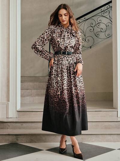 レオパード グラデーション プリント 長袖 フィッテッドウエスト エレガントドレス-23%