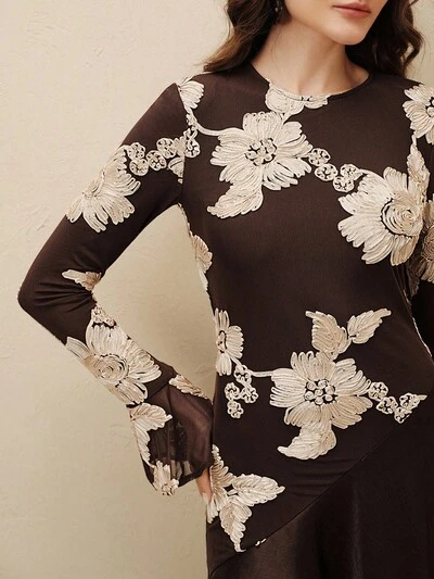 エレガントなヴィンテージスタイル ファッショナブル 3Dエンブロイダリー セクシーなフィット&フレアスリーブ パッチワークドレス レディース-26%