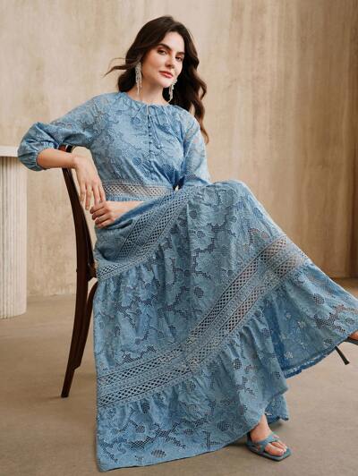 フレンチエレガントなレースアップレースホールアウト3/4袖ドレス、エレガントなオフィスドレス、女性用ウエスタンアウトフィット、ボヘミアン風女性服-25%