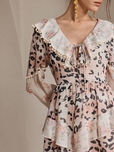 スプリングエレガントウィメンズ パッチワーク 花柄プリント フリルトリム 長袖 短め バケーションドレス-43%
