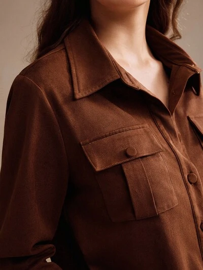 女性用エレガントな襟付き長袖ポケットシャツ、ブラウンブラウス-48%