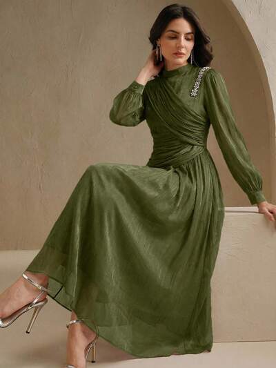 新作エレガントなラメ入りドレープドレス 長袖、春夏、パーティー、結婚式、新年、バレンタインデーに適しています-46%