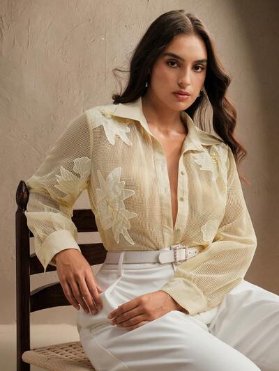 レディース プラスサイズ 重厚なクラフトメッシュ刺繍 プレミアム 多用途 長袖シャツ 春 女性用 フェスティバル、エレガント、ホリデー、バケーション、カジュアル、ビーチ-55%