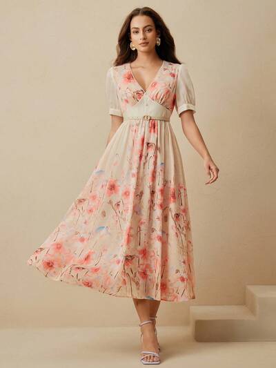 エレガントな花柄フローイーミディアムドレス(女性用)-41%