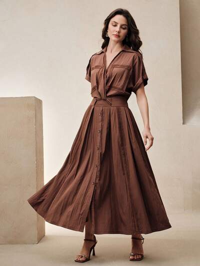 ロマンチック カジュアル レース パッチワーク バケーションスタイル シャツドレス、コーヒーカラー、春夏-57%