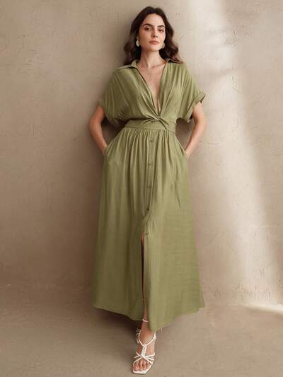 Anewsta Essential ウィメンズファッション カラー付き ツイスト ウエスト Vネック シングルブレスト ロングワンピース ドレス、フェスティバル お出かけ バケーション アウトフィット-55%